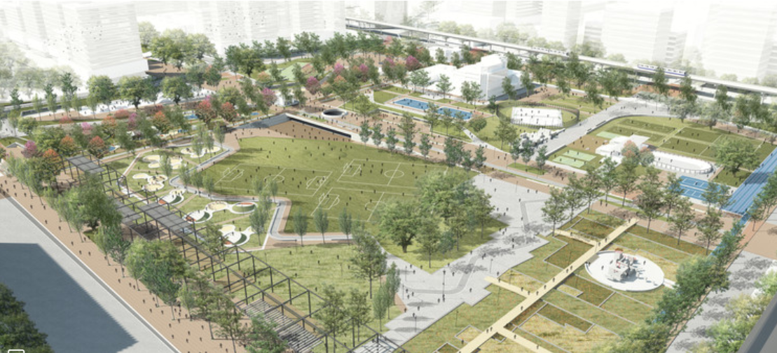 Propuesta: Plantea un interesante orden de la estructura urbana en relación con su contexto, buscando reconectar el parque a los tejidos urbanos, históricos y ambientales de la ciudad, a través de un programa recreo-deportivo como eje transversal.