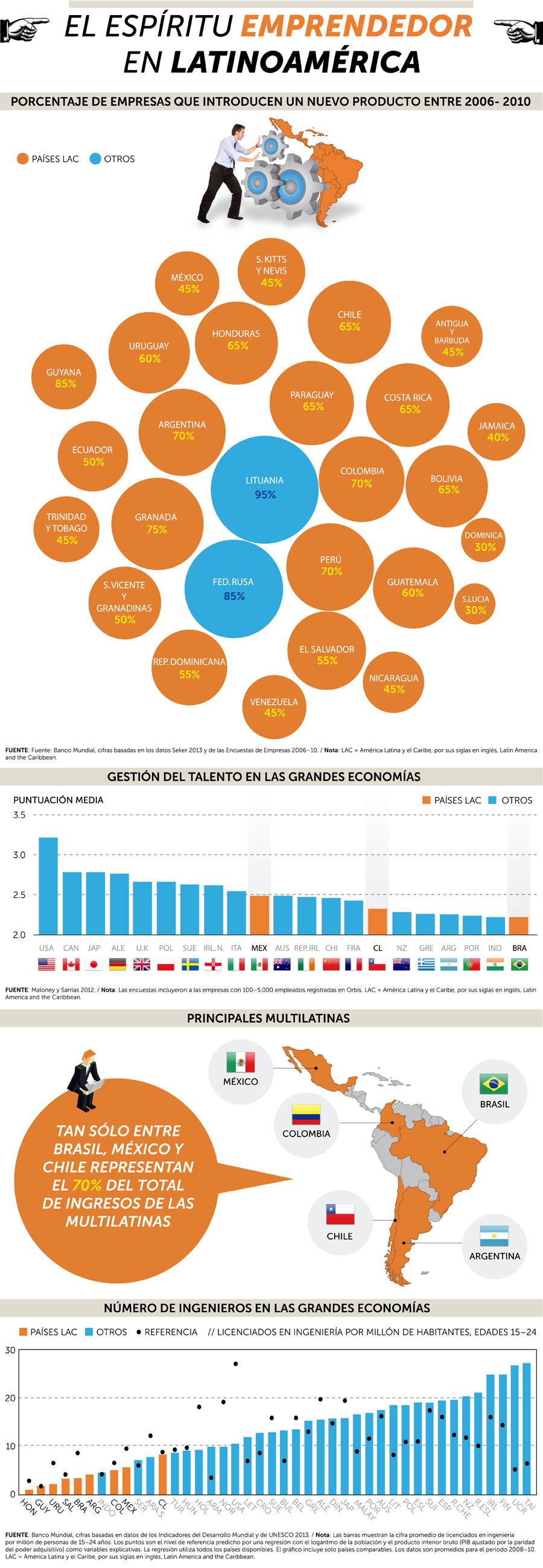 América Latina y el Caribe se caracterizan por la vitalidad de su emprendimiento según la medida del número de empresas per cápita. En la siguiente infografía del Banco Mundial se puede evidenciar el espíritu emprendedor en Latinoamérica con los porcentajes de empresas que introdujeron un nuevo producto entre 2006 y 2010, entre los países destacados se encuentran Perú, Colombia y Argentina.