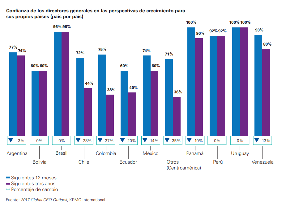 El siguiente gráfico, tomado del estudio, muestra la confianza que tienen los directores generales respecto al crecimiento de sus organizaciones en cada uno de los países latinoamericanos. El país con más confianza empresarial es Uruguay, seguido de Brasil, mientras que Chile y otros países en Centroamérica presentan poca confianza en perspectivas de crecimiento.