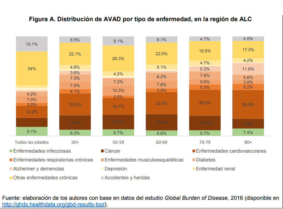 El siguiente cuadro, extraído del estudio, indica los porcentajes de las enfermedades según la edad de las personas en América Latina y el Caribe del año 2016. Se puede observar que las enfermedades cardiovasculares afectan en un 22% a los mayores de 60 años, en un 26% a los mayores de 70 años y en un 28,8% a los mayores de 80 años. Seguida de las enfermedades crónicas que el porcentaje oscila entre un 17,3% y un 22%.